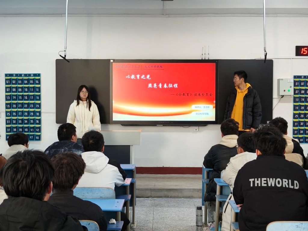 11月1日,交叉科学学院于第二教学楼302教室开展“以教育之光,照亮青春征程”《论教育》读书分享会。本次分享会由智能材料251班关贺与王语彤主讲,同学们积极参与,共同探讨教育的时代价值与青年担当。