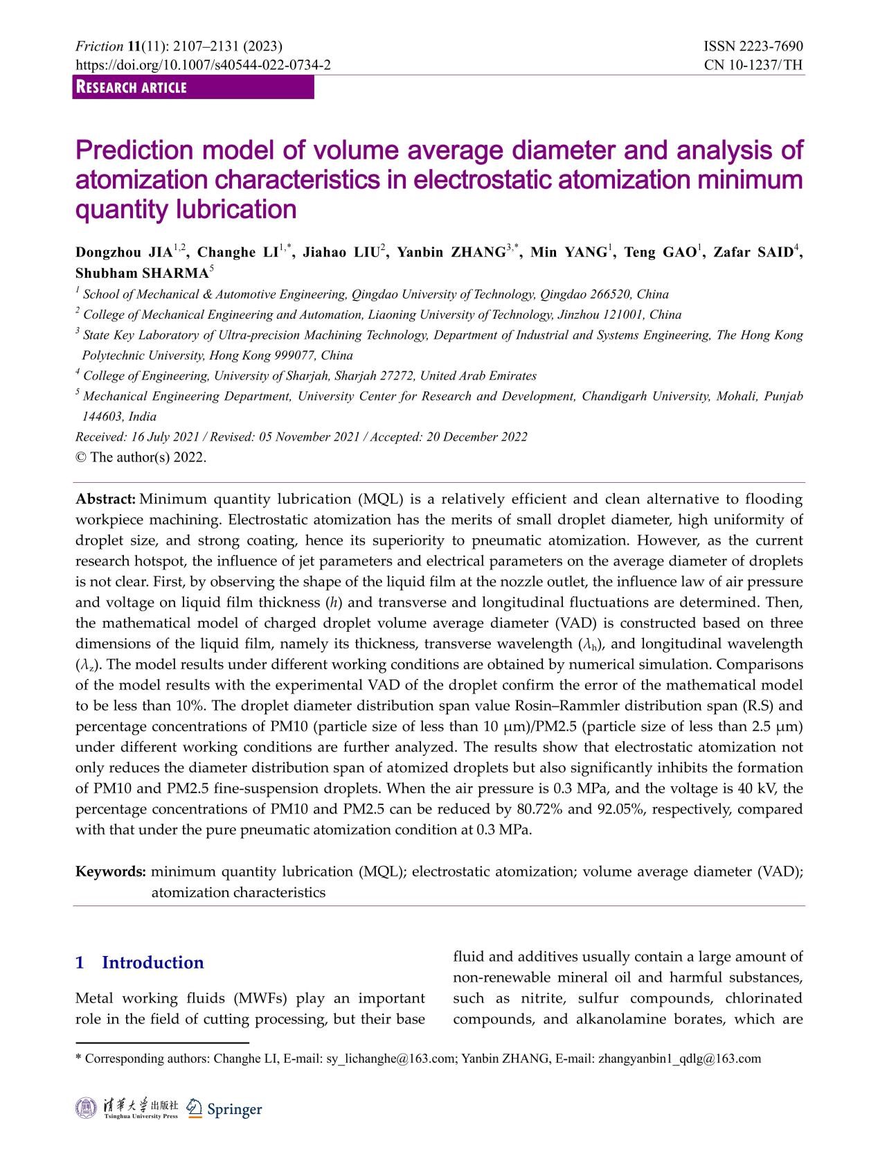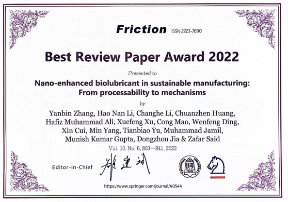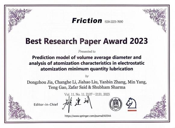 贾东洲教师的主要获奖论文题为“Prediction model of volume average diameter and analysis of atomization characteristics in electrostatic atomization minimum quantity lubrication”。该研究在精密制造过程中的绿色润滑冷却技术方面提出了创新模型与方法,因其重要的理论价值与工程应用前景,获评2023年度最佳研究论文。其参与撰写的综述论文也因高度的系统性和前瞻性,同时获颁2022年度最佳综述论文奖。